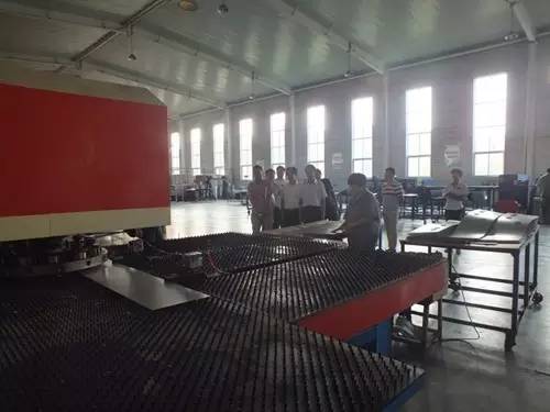 在參觀完太陽能真空集熱管制造車間后又到了太陽能工程設(shè)備總裝車間,先后參觀了全自動下料開平設(shè)備、轉(zhuǎn)塔式全自動數(shù)控沖床生產(chǎn)線、全自動外皮雙頭縮口滾花機、臥式反向積放發(fā)泡生產(chǎn)線、環(huán)戊烷聚氨酯高壓發(fā)泡機、全自動數(shù)控打包生產(chǎn)線以及壁掛太陽能生產(chǎn)線等等。