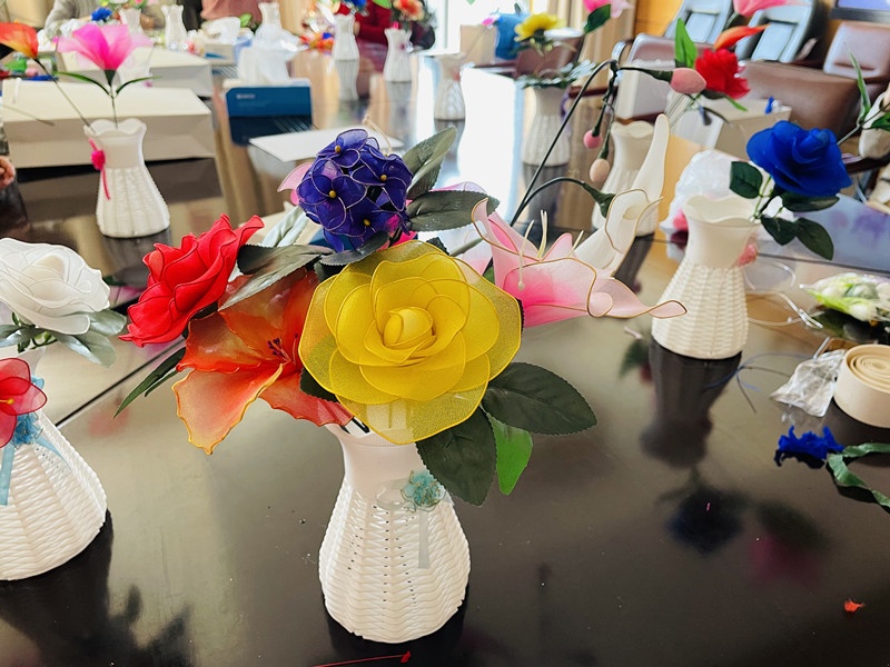 女神們一個(gè)個(gè)臉上洋溢著燦爛的笑容,手里忙活著自己的材料:絲網(wǎng)、鐵絲、花桿、花葉、尖嘴鉗、剪刀……正在大家不知所措的時(shí)候,幸好有我們熱情的鐘敏亞“鐘老師”為我們講解了制作過程:1、套筒:將鐵絲繞模具成一個(gè)圈,尾端留出1厘米,用鉗子將鐵絲尾端攪在一起。2、將絲網(wǎng)裹在鐵圈,形成一個(gè)個(gè)大小不同的花瓣。3、將花瓣一片一片地綁上去。4、花瓣綁緊后,花的樣子就定下來了。5、稍作修飾,放上花葉,把花瓣用手輕輕按壓,一朵栩栩如生的花朵就出來了。看看桌上有不同顏色的玫瑰花、百合花……都是由各位女神們巧手制作而成的。