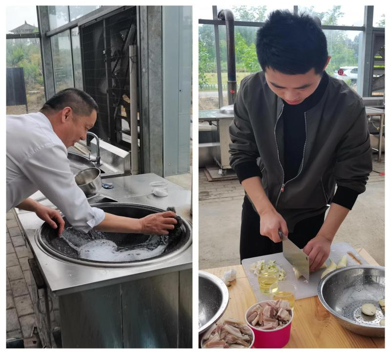 桐鄉(xiāng)的主題是“野火飯”,首先,洗鍋備菜?!耙盎痫垺钡脑弦话憧梢跃偷厝〔?,主料大米,經(jīng)典的配料由咸肉、春筍、豌豆和蕎蔥四樣組成?!耙盎痫垺彪m說野字打頭,但是其制作過程卻一點(diǎn)也不簡(jiǎn)單,需要先把咸肉、豌豆、筍等預(yù)先下油鍋炒至半熟,當(dāng)香味開始散開,侵襲你的味蕾時(shí),則快速將一旁迫不及待的米下鍋,鎖住這四處逃逸的香味,翻炒幾下,此時(shí)鍋中的各種食材似在激烈地斗爭(zhēng),那急促升起的油煙便是最好的證明。