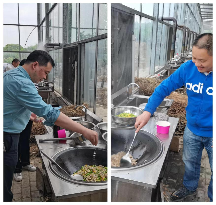 今天的兩位主廚主要是陳總和陸師傅,先將肉翻炒至七八成熟,再倒入豌豆、玉米粒,翻炒一陣后加入調(diào)味料使菜色入味,最后加入生米和水,蓋上鍋蓋。在半個(gè)多小時(shí)的等待后,香噴噴的野火飯閃亮登場(chǎng),清香四溢,熱氣升騰,夾雜著咸肉的鮮香和豌豆的清甜,鍋壁上形成的鍋巴焦脆可口,好評(píng)絡(luò)繹不絕。