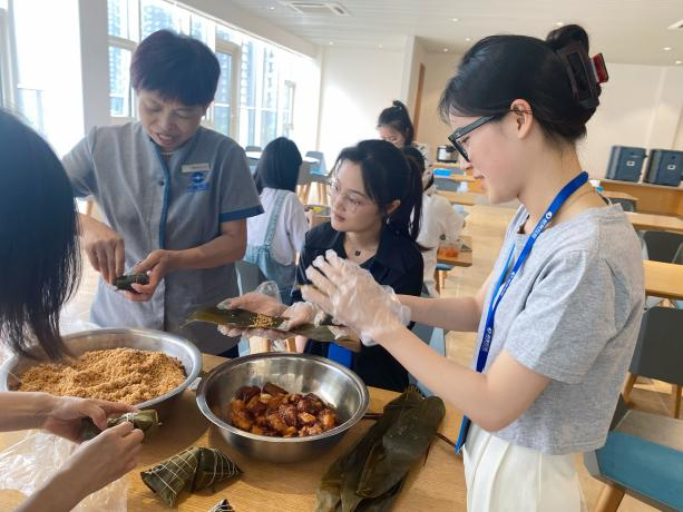 “玉粽襲香千舸競,艾葉黃酒可驅(qū)邪”。各地方的粽子各有特色,有香甜的蜜棗粽子、咸口的鮮肉粽子等,每一種都是舌尖上的美食?;顒?dòng)當(dāng)天,一行人紛紛齊聚一堂參與“包粽子”活動(dòng),工作人員也早已在豬肉餡里加入各種調(diào)味料:生抽、老抽、鹽等使得味道更加鮮美,在另一邊,放置了幾大盆提前泡好的醬油糯米及粽葉,簡簡單單不加任何修飾的食材便足以令人迫不及待想要一食為快。