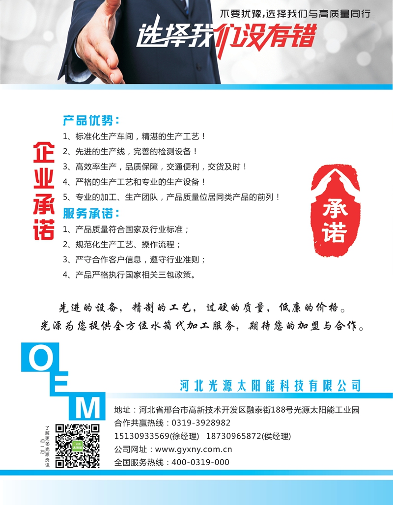 謙尊而光,酌水知源。前行中的光源太陽能,感恩客戶,固本創(chuàng)新,以振興民族太陽能光熱產(chǎn)業(yè)為己任,將“打造太陽能世界品牌”作為企業(yè)發(fā)展目標(biāo),高歌奮進(jìn),光耀東方!