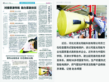 2018年11月22日,河北日報(bào)刊登河北光源太陽能科技有限公司生產(chǎn)蓄熱式智能電鍋爐的圖片新聞。